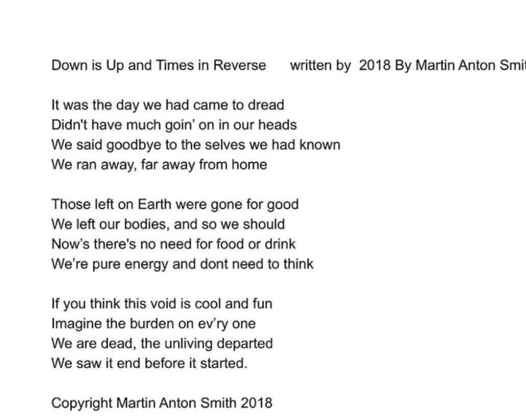 ImageDown is up and Times in Reverse (A Poem) February 12, 2021June 30, 2022Posted in Uncategorized Share this: Click to share on X (Opens in new window) X Click to share on Facebook (Opens in new window) Facebook Like Loading... Related