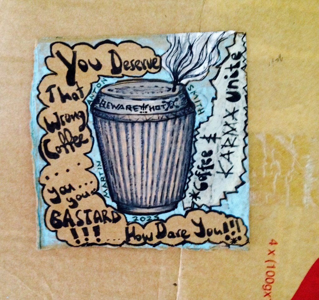 So I make the greeting card – I have water colors & ink etc. -The final image is a ‘fat sunglasses wearing santa’ with his shirt off. In one hand is a beer bottle & the other is ‘Santa Sack (full of ‘prezzies’). Santa saying that he is quiting because he’d rather go to the ‘asian eatery’. At the bottom of the image there is a rat that says “Santa you lazy bastard”.