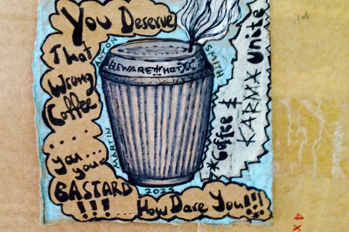 I sit & start eating my fish & chips. I have a book on the table – poetry. It has a crappy bookmark. lo & behold the little girl (perhaps 7 years old) comes & gives me a Chinese ornamental book-mark as a gift (the ones housed in plastic). I say thankyou that’s great as I need a better bookmark. The little girl has a real kindness to her. She has a little soft toy lamb in her arms & I ask her if it has a name – she says no, so I say ‘you could call it ‘Bleetie’ – I’m not sure if she understood its relevance. I said thankyou & goodbye.